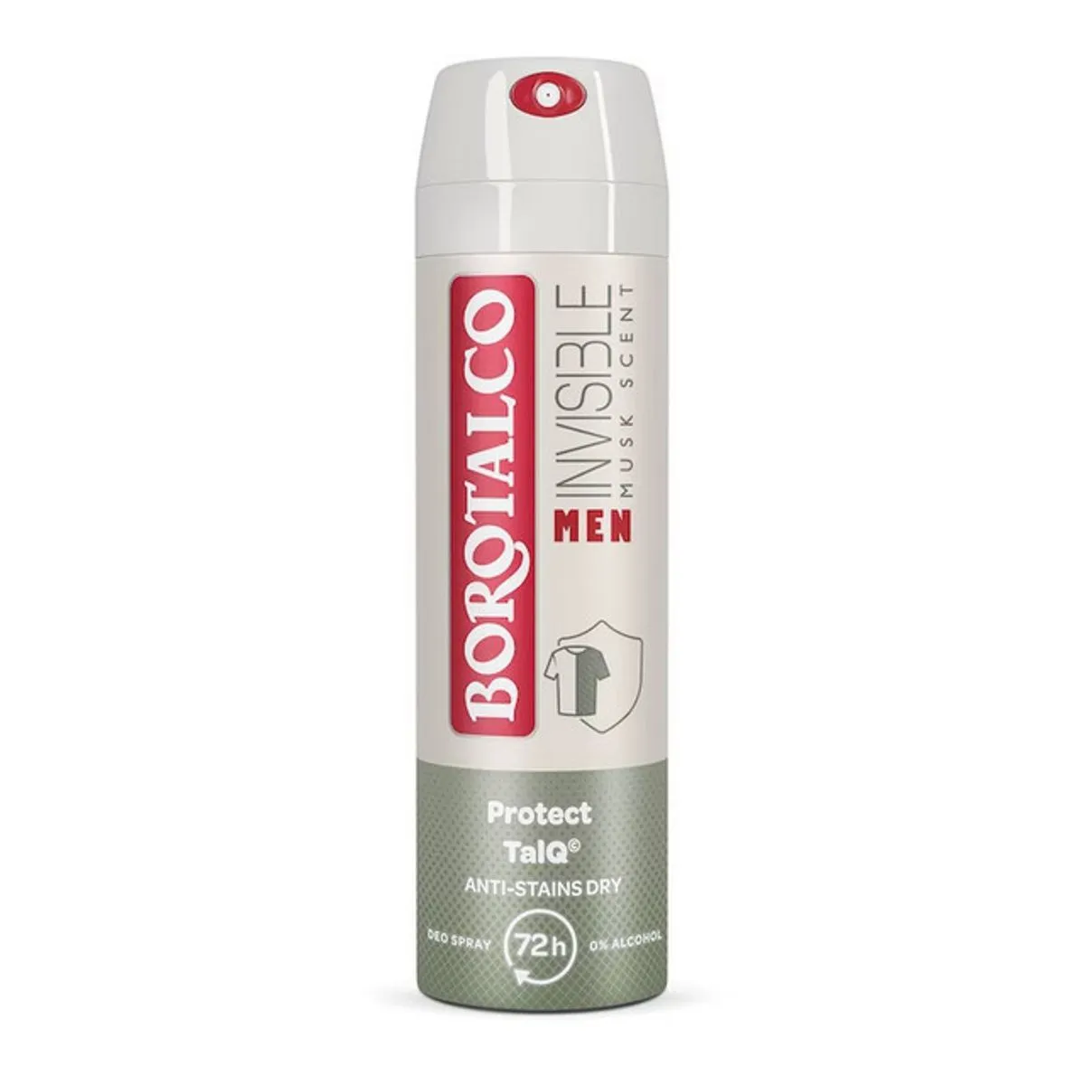 Borotalco Men Invisible, cu formula Protect TalQ©, pentru barbatii care cauta protectie impotriva transpiratiei si a petelor de pe haine.Formula exclusiva care combina protectia uscata a pudrei de talc cu o retea de molecule invizibile capteaza si previne efectul de halo, mirosurile neplacute si petele.Pentru protectie impotriva petelor de pe haine si o senzatie de piele extra-uscata;Eficacitate de pana la 72h.0% Alcool. testat dermatologic.