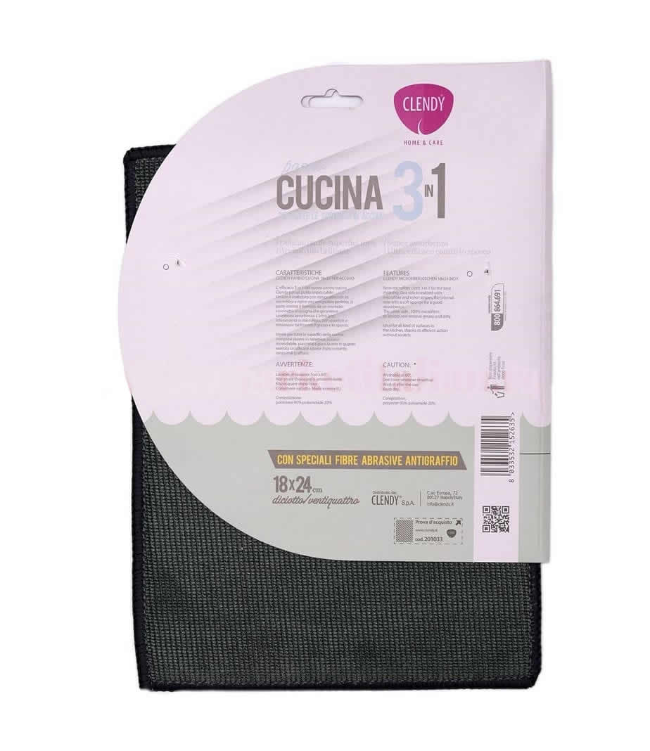 Eficacitatea 3 în 1 a lavetei de bucătărie Clendy, oferă o curățare impecabilă. Este confecționată din benzi alternative cu microfibre și nylon pentru o curățare perfectă și dintr-un strat de burete moale, care garantează o absorbție ridicată. Cealaltă parte, în întregime în din microfibră, este destinată pentru a absorbi și elimina cu ușurință grăsimea și murdăria.