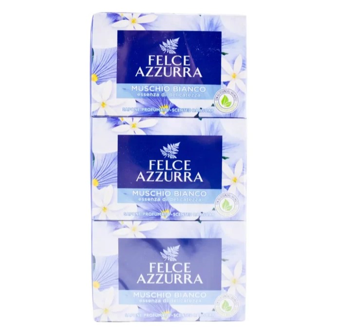 Felce Azzurra Muschio Bianco – sapun solid cu parfum de musc alb. Transparența fructelor citrice și cremozitatea muscului alb se transforma într-o moale imbratisare ce iti alinta pielea cu un parfum proaspat, oferind in acelasi timp hidratare naturala.Născut ca un săpun de frumusețe, atunci când inca nu existau alte produse de igienă personală, acesta este un produs total natural, îmbogățit prin prezența glicerinei, cunoscuta pentru propietatile sale hidratante si emoliente.